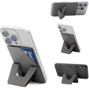 Phone Tripod Wallet for iPhone,Lightweight & Portable Phone Stand,Strong Magnetic Card Holder Fit 2 Cards & 3 Viewing Angles & Stain-Resistant Vegan Leather Grey