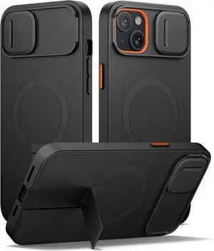 for iPhone 14 Plus/15 Plus Case with Magnetic Camera Slide Cover and Adjustable Kickstand Compatible with MagSafe Shockproof Bumper Case Slim Protective Cover 6.7 Inch Black