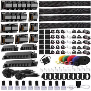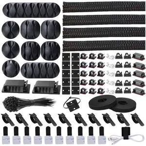 192 PCS Cable Management Kit 4 Wire Organizer Sleeve,11 Cable Holder,35Cord Clips 10+2 Roll Cable Organizer Straps and 100 Fastening Cable Ties for Computer TV Under Desk, black,clear