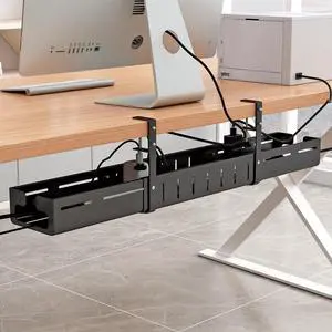 Under Desk Cable Management Tray, Expandable Length 25.2"-38.6",No Drill No Damage to Desk,Cable Tray with Clamp for with Wire Management,for Cord Organizer for Home Office Standing Desk, Black