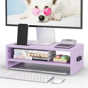 BONTEC Wooden Monitor Stand Riser, 2-Tier Desk Shelf with Storage Organizer, Ergonomic Computer Stand with Cable Management, Cellphone Holder, Purple, 16.5 Inch