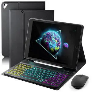 Keyboard Case for iPad 9.7 inch, iPad 6th (2018)/iPad 5th Gen(2017), iPad Pro 9.7(2016), iPad Air 2 (2014) - 7 Color Rainbow Change Backlit Magnetic Keyboard Built in Pencil Holder with Mouse- Black
