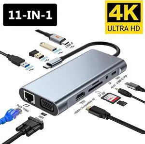 Type: Docking StationStandards: USB CMax Devices Supported: 11-PortPorts: USB C hub multiport adapter equips with USB-C, 3*USB 3.0, 4K HDMI, VGA, 1000Mbps Ethernet, SD/Micro SD card reader, 100W power delivery, and 3.5mm audio port.Model #: E-BYL-2310-2