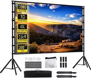 100 inch Projector Screen with Stand, 16:9 HD Portable Outdoor Projection Screen with Carry Bag for Home Theater, Backyard Movie Night