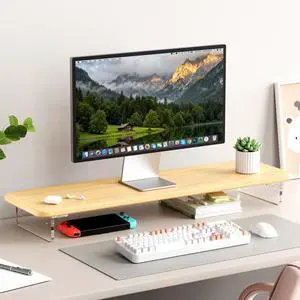 AFOOYO Monitor Stand Riser, Bamboo & Acrylic Computer Monitor Stand with LED Light, 31.5 inch Large Monitor Stand for Desk, Desktop Organizer Stand for Computer, Laptop, Printer, PC & TV Screen Riser