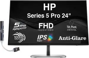 HP Series 5 Pro 24" FHD IPS Monitor with 5ms Response Time, Anti-Glare, Flicker Free, 350nits Brightness, 100 Hz Refresh rate, Displayport, HDMI & Dockztorm USB Port Expander, Black/Silver Color