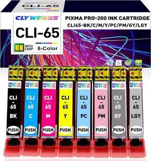 CLI-65 Ink Cartridges Compatible with Canon PRO 200 Printer - High Capacity Compatible with PIXMA PRO-200 Printer, 8 Color Pack (1BK, 1C, 1M, 1Y, 1PM, 1PC, 1GY, 1LGY)