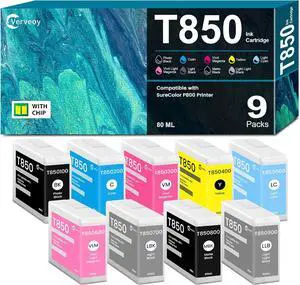 Remanufactured T850 Ink Cartridge Full Set 850 80ML High-Capacity Replacement for T8501 T8502 T8503 T8504 T8505 T8506 T8507 T8508 T8509 Ink with SureColor P800 Printer Ink-9/Pack