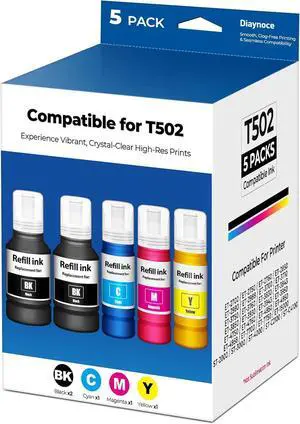 Compatible for T502 Ink Refill Bottles Eco Tank ET-2850 ET-3850 ET-4850 ET-15000 Replacement for E-pson T502 Ink (5 Bottles) for ET 2850 ET 3850 ET15000 ET4850 ET-2760 ET-3830 ET3843 ET-3760 ET2750
