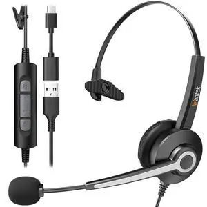 Monaural Corded USB Headsets with Noise Cancelling Mic and in-line Controls, UC Business Headset for Skype, SoftPhone, Call Center