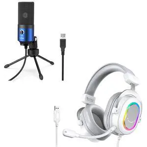 FIFINE USB Microphone and White Gaming Headset, PC Microphone with Gain Control, Wired Headphones with 7.1 Surround Sound,EQ Mode, RGB, Soft Ear Pads for Streaming, Podcasting, Twitch (K669G+H6W)