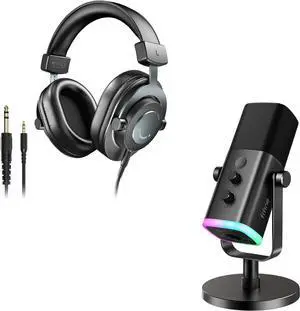 FIFINE XLR/USB Microphone and Studio Monitor Headphones Set, Computer Recording Mic with Mute Button, RGB, Over Ear Wired Headset Pack for YouTube Podcasting Streaming Gaming (AM8+H8)