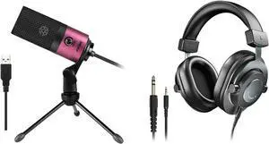 FIFINE Pink USB Mic and Studio Headphones for Recording, USB Podcasting Condenser Microphone On Computer/PS4/PS5,Wired Headphones 3.5mm/6.35mm for Streaming Recording Podcast Monitoring (K669+H8)