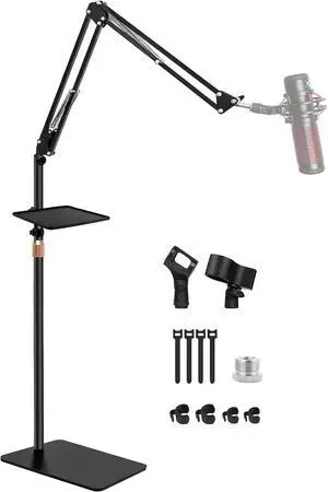 BILIONE Microphone Stand with Weighted Base, Mic Floor Stand Boom Arm with Mic Accessory Tray, Microphone Clip Holder, 3/8" to 5/8" Screw Adapter, Cable Ties