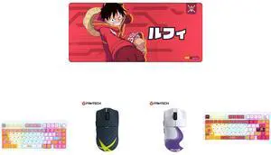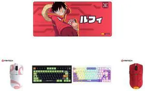 FANTECH One Piece Edition Luffy Gaming mousepad, MP905 Deskmat, Wear-resistant, waterproof, and slip-resistant rubber mat with a stylish design, 36*16*0.2 inch mouse pad, Red and FANTECH MK921 Gaming Mechanical Keyboard,One Piece Edition, Wireless/Wired/BT Connection ,RBG Controls, 80 Keys, USB-C Interface, White Shaft, White pink,Nami and Fantech One Piece Zoro Edition Wireless Gaming Mouse, PixArt PAW3311 Sensor, 57g Lightweight, Tri-Mode Connectivity, RGB Charging Dock, 12000 DPI for PC & Mac, WG13E Deep Blue and Fantech One Piece Gear 5 Luffy Edition Wireless Gaming Mouse, PixArt PAW3311 Sensor, 57g Lightweight, Tri-Mode Connectivity, RGB Charging Dock, 12000 DPI for PC & Mac, WG13E Purple and Fantech One Piece Luffy Edition Wireless Gaming Mouse, PixArt PAW3311 Sensor, 57g Lightweight, Tri-Mode Connectivity, RGB Charging Dock, 12000 DPI for PC & Mac, WG13E Red