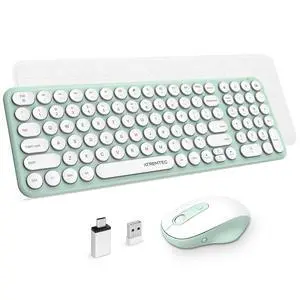 Wireless Keyboard and Mouse, Compact Full Size Cute Keyboard Retro Round Keycap - 2.4GHz Ultra-Slim Quiet Aesthetic Keyboard for Laptop iMac Windows Computer (Macaron Green A)
