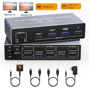 Video Resolution: USB3.0 dual monitor KVM switch supports resolution up to 8K@60Hz/[email protected] dual monitor KVM HDMI2.1+DP1.4 switch supports 2 computers that with different resolutions, such as 1 computer is 4K@60Hz, the other is 4K@30Hz, 1440P@60HZ, 3D 1080P@60HZ or lower resolution.