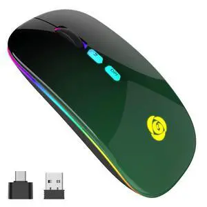 LED Wireless Mouse, Bluetooth Mouse &2.4GHz Instant Connection,Rechargeable Ultra Silent Slim,3 DPI 2 Connection Modes with USB-C to USB Adapter for Laptop/MacBook/PC/Tablet/iPad (Black-green)