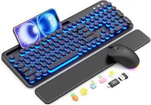 Wireless Keyboard and Mouse Combo - Backlit Typewriter Keyboard with Magnetic Wrist Rest & Phone Holder, Light Up Round Keycaps, 2.4GHz Cordless Set for Mac, Windows, PC, Laptop,