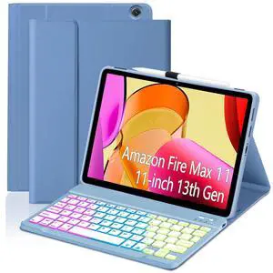 Case with Keyboard for Amazon Fire Max 11 inch (13th Generation, 2023 Release),7 Color Rainbow Backlit Detachable Type-C Charging Keyboard Magnetic Case Pen Holder 13th Gen-Black with Blue