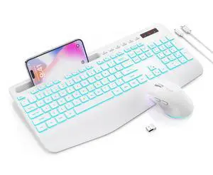 Wireless Keyboard and Mouse Combo with 7 Colored Backlits, Wrist Rest, Rechargeable Ergonomic Keyboard with Phone Holder, Silent Lighted Full Size Combo for Windows, PC, Laptop (Cloud White)