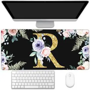 KOAIWPAE Desk Pad, Flower Golden Letters R Extended Gaming Mouse Pad Large, 35.4"x15.7" Big Mouse Pad with Non-Slip Base and Stitched Edge, Long Computer Keyboard Mouse Mat for Home Office Work