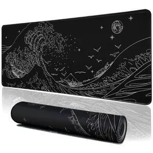 MEWOOCUE® Large Gaming Mouse Pad for Computer,Black Japanese Sea Wave Anime Mouse Mat,Long XXL Waterproof Keyboard Pads,Big Non-Slip Mouse Pads for Game Office Home15.7 x 35.4 in