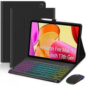 Case with Keyboard Mouse for Amazon Fire Max 11 inch (13th Generation, 2023 Release),7 Color Rainbow Backlit Detachable Type-C Charging Keyboard Magnetic Case Pen Holder 13th Gen Black