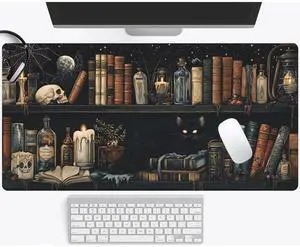 Dark Academia Witch's Bookshelf Desk Mat Skull Black Cat Magic XXL Large Extended Gaming Mouse Pad Gamer Work Office Computer Deskmat Mousepad Laptop Keyboard Mat Desk Pad 35.4x15.7 in