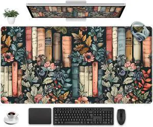 Floral Books Desk Mat Reading Desk Pad Mouse Mat XXL, Colorful Mouse Keyboard Pad Flower Bookshelf Desktop Mat, Long Computer Mats Aesthetic Desk Accessory Reader's Home Decor 31.5" x 15.7"