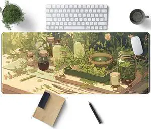 Green Gardener Desk Mat Anime Forest XL Gaming Mouse Pad Plant Lover Desk Pad with Stitched Edges, Women Desktop Decor Mousepad Laptop Computer Keyboard and Mouse Mat Desk Accessories 31.5x11.8 in