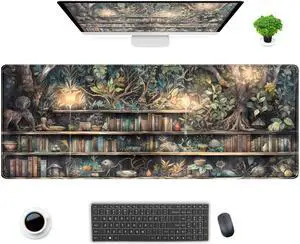 Kawaii Green Tree Desk Mat Cute Mouse Pad Anime Forest Library Book Mousepad XL Large Extended Gaming Desk Matt for Desktop, Keyboard and Mouse Mat for Women Office Decor Accessories 31.5x11.8 in