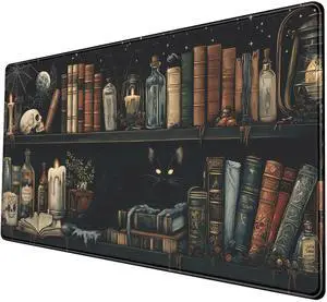 Mystic Grimoire Desk Mat - Black Cat on Bookshelf Large Mouse Pad- Gothic Library with Skull Bottles Extended Desk Pad- Dark Academia Starry Night XL Mouse Pad for Gaming Study Work 31.5 * 15.7in