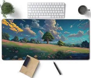 Anime Grass Flowers Blue Sky Large Mouse Pad, Vintage Aesthetic Gaming Desk Mat, XXL Keyboard Desk Pad Mat for Desktop, 35.4"x15.7" Non-Slip Base Big Mousepad with Stitched Edges