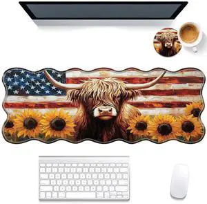 DHEEBFWE Large Gaming Mouse Pad for Desk, 31.5x11.8in, Irregular Wavy Stitched Edges, XL Mousepad with Anti-Skid Rubber Base, Keyboard and Mouse Mat, Office Desk Writing Pad,Cute Cow Sunflowers
