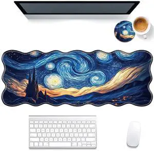 DHEEBFWE Large Gaming Mouse Pad for Desk, 31.5x11.8in, Irregular Wavy Stitched Edges, XL Mousepad with Anti-Skid Rubber Base, Keyboard and Mouse Mat, Office Desk Writing Pad,Van Gogh Starry Night