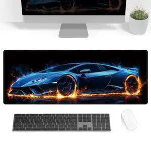 Blue Sports Car Gaming Mouse Pad, Speed Car Large Extended Desk Mat 35.4x15.7 inches with Non-Slip Base & Stitched Edges, Waterproof Desk Mat for Office, Home, Laptop, Computer Keyboard