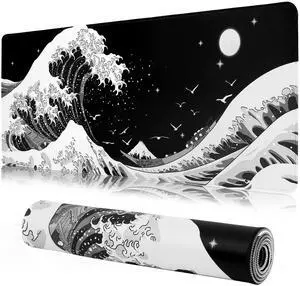MEWOOCUE Gaming Mouse Pad for Desk,Large Sea Wave Mousepad Laptop,Black White Japanese Anime Mouse Mat,Long XXL Waterproof Keyboard Pads,Big Non-Slip Mouse Pads for Game Office Home31.5 x 11.9 in