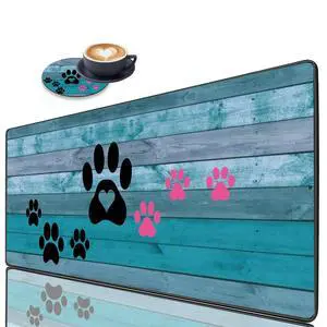 Extended Gaming Mouse Pad with Stitched Edges, Large Anti-Slip Mouse Pad (31.5x11.8 Inches) Desk Pad Keyboard Pad + Coaster for Work/Gamer/Home, Black and Pink Dog Paw Prints