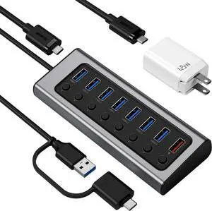 BENFEI 7-Port USB 3.0 Data Hub with BC 1.2 Charging Port, 45W GaN Super Fast Charger Dual Type C