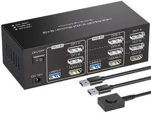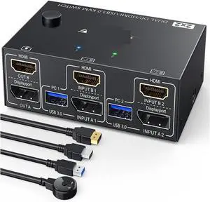 KVM Switch 2 Monitors 2 Computers USB C HDMI DP, KVM Switch Dual Monitor for Laptop & Desktop, USB 3.0 MST Dual HDMI 4K@60Hz, PD 60W for Laptop, with Wired Remote