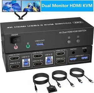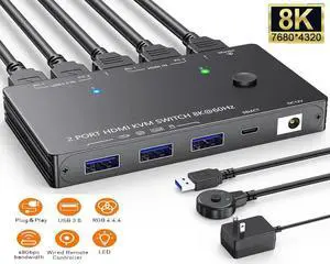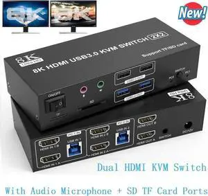 8K DisplayPort + HDMI KVM Switch 2 Monitors 2 Computers, 8K@60Hz Support Extended & Duplicate Mode with 4 USB 3.0 Hub, 8K@60Hz HDMI DP KVM Switches,EDID Adaptive, Plug and Play