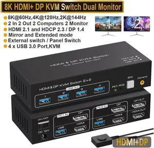 8K KVM Switch, DP USB C Switcher 2 in 1 Out Switches for 2 PC Share Keyboard Mouse Printer and 1 Monitor, Support Full HD 8K@60Hz with One Button Switch, 2 USB C Cable and 1 USB-C Power Cable
