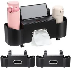 2 Pack Multifunctional Car Seat Back Storage Box Car Seat Back Organizer with Tissue Box, 2 Cup Holders and Hooks for Hold Phone, Drinks, Handbag, Fits for Most Vehicles(Black)