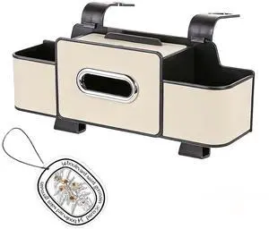 5-in-1 Car BackSeat Organizer, Multifunctional Storage Box with Drink Cup Holders, Tissue Box & Cover, Hanging Hooks, Table Tray for Phone and Tablet - Perfect for kids/Family Road Trip/Travel (Beige)