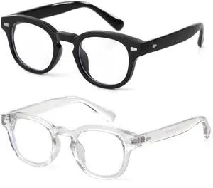 Onrtry Round Blue Light Glasses for Women Men Small Thick Frame Eyeglasses Non Prescription Glasses Clear lens Eyewear 2 Pack(Black+Transparent)