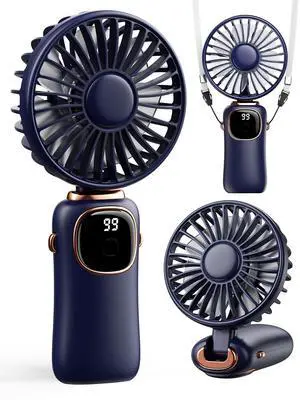 Portable Handheld Fan, 4000mAh Battery Operated Fan with LED Display, Handheld/Neck/Desk 3 in 1 Personal Small Fans, 90° Foldable Desk Fan with Base, 5 Speed Makeup Lash Fan for Women Blue