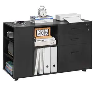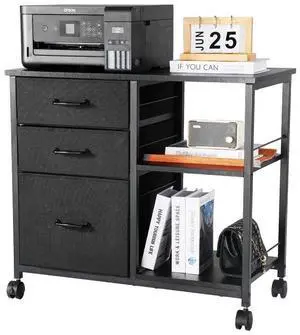 Mobile Metal File Cabinet with 3 Fabric Drawers and 2 Open Shelves Black