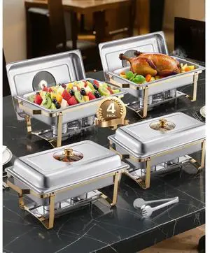 VEVOR 8 Qt 4 Pack Rectangle Chafing Dish Buffet Set Full Size Pan Stainless Steel Gold