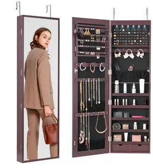 VEVOR Mirror Jewelry Cabinet 47.05in Lockable Wall or Door Mounted Armoire Brown